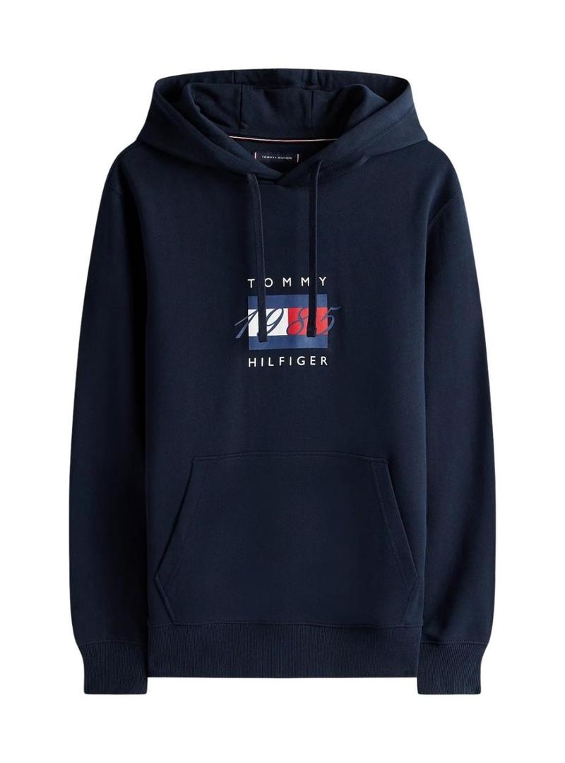 Moletom Tommy Hilfiger. Modelo Linear. Cor azul marinho. Capuz com cordão ajustável. Punhos elásticos. Bolso canguru. Logo 1985 estampado no peito. Ajuste regular.