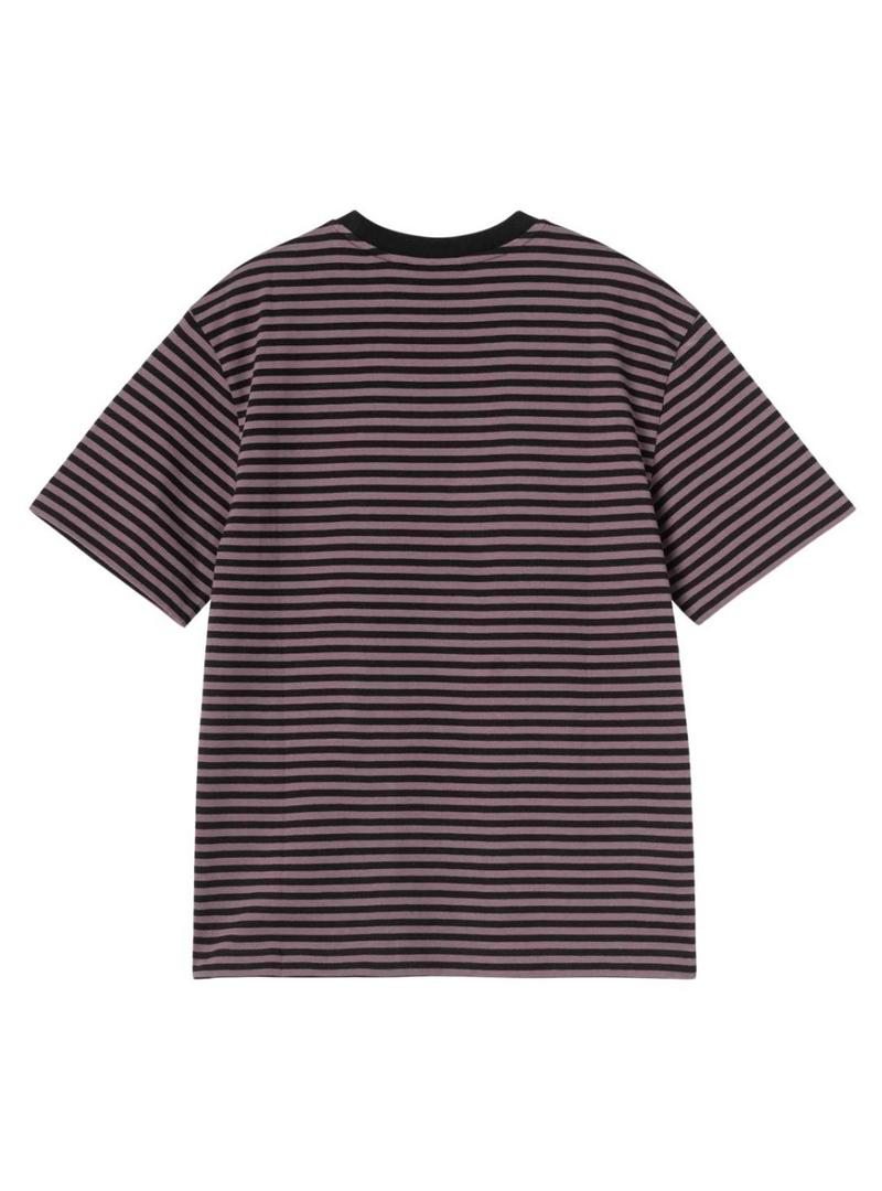 Camiseta Carhartt. Modelo Verner. Cor rosa e preto. Logo bordado no peito. Corte quadrado. Tecido com listras horizontais. Manga curta.