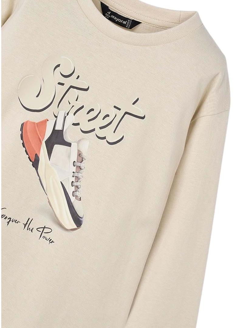 Camiseta Mayoral. Manga comprida. Gola redonda. Cor bege. Estampado no peito. Ombros levemente caídos.
