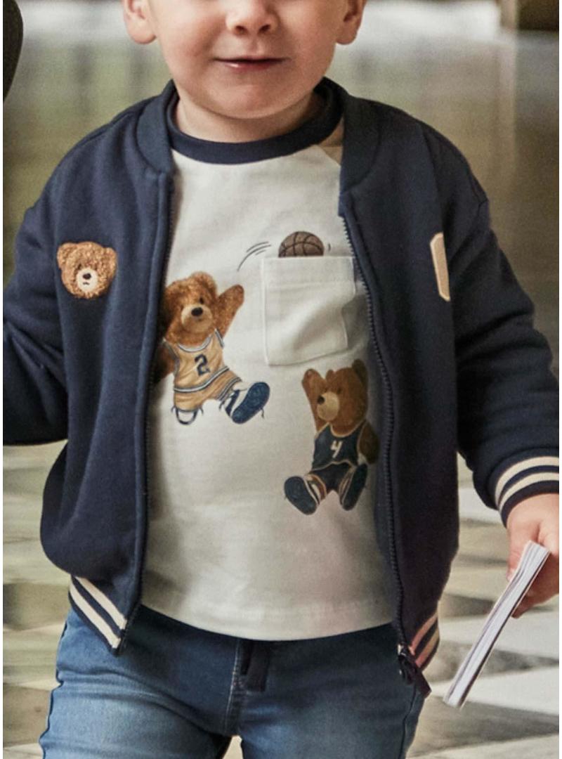 Camiseta Mayoral. Manga comprida. Combinada. Gola redonda. Bolso decorativo no peito. Estampa de ursos na parte da frente. Gola em contraste. Detalhe de listras nas mangas.