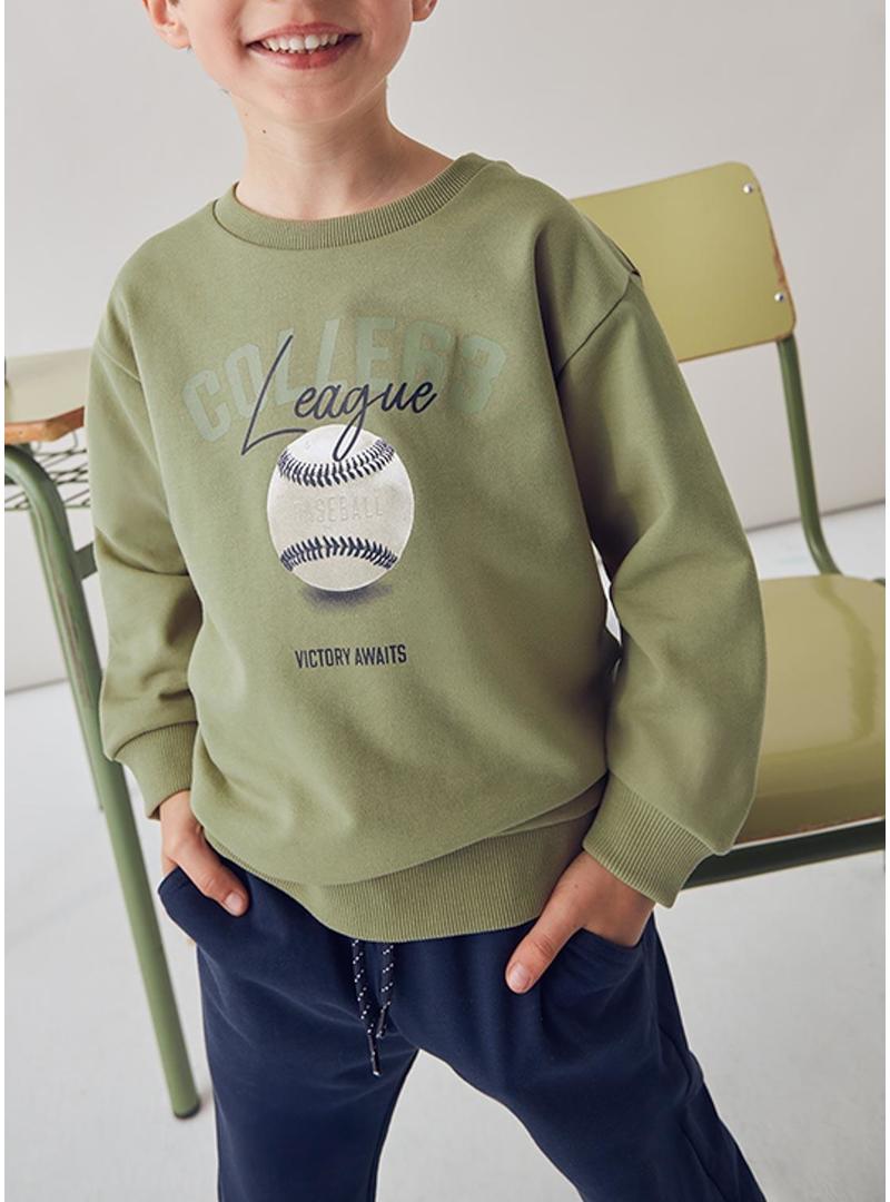 Conjunto Mayoral. Moletom verde. Estampa universitária no peito. Mangas compridas. Ombros caídos. Acabamentos canelados. Calça esportiva azul-marinho. Cintura de elástico com cordão. Bolsos laterais. Barra elástica.