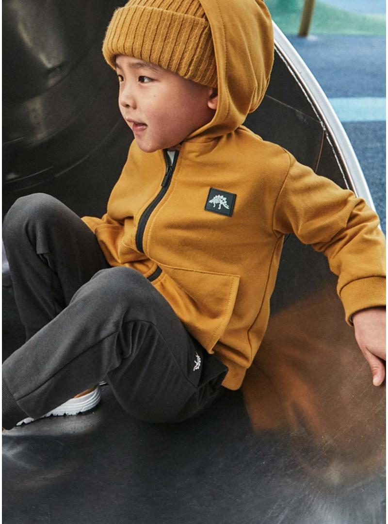 Conjunto de treino Mayoral. 3 peças. Moletom cor mostarda. Fechamento com zíper. Com capuz. Manga longa. Calça cor cinza. Formato longo. Cintura de elástico ajustável com cordão. Bolsos laterais. Um bolso traseiro. Camiseta cor branca. Manga longa.