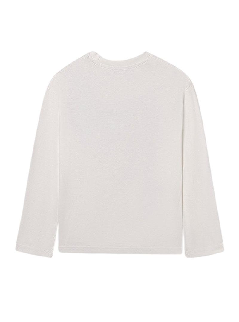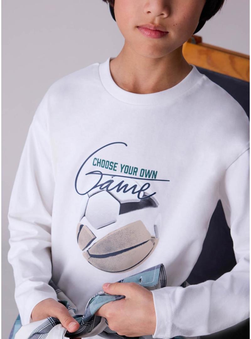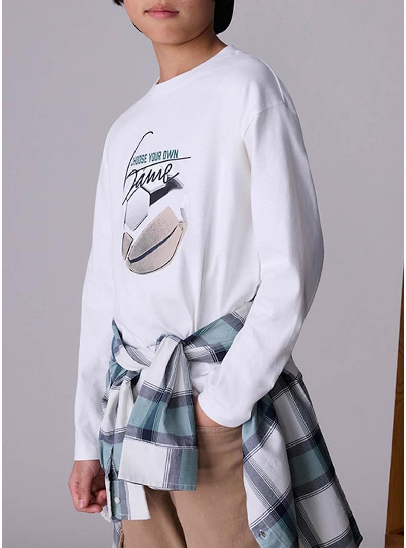 Camiseta Mayoral. Cor branca. Manga comprida. Gola redonda. Estampado no peito. Peça com um código QR. Ao escanear o QR, terás acesso a um jogo exclusivo da Mayoral.