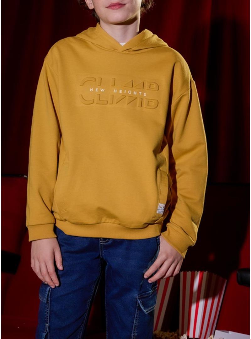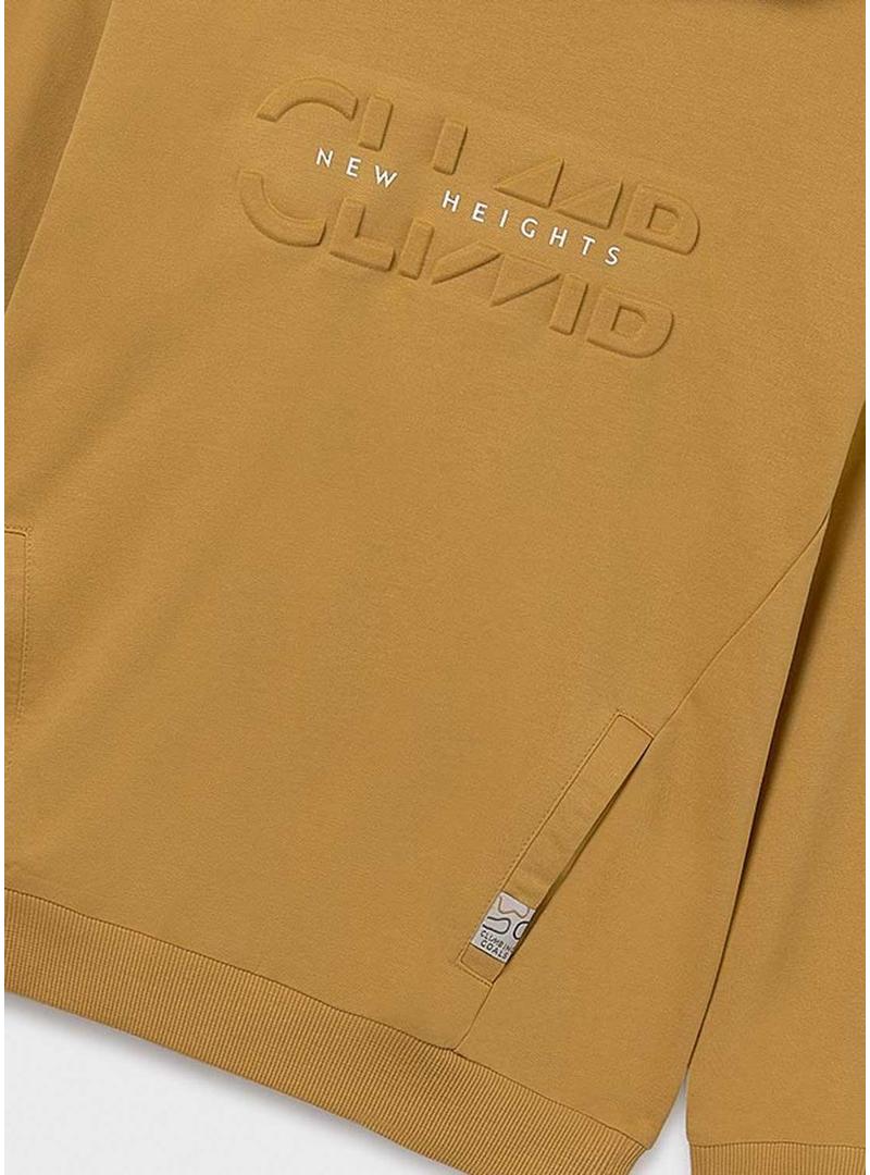 Moletom Mayoral. Cor mostarda. Com capuz. Manga comprida. Bolsos laterais. Estampa em relevo no peito. Acabamentos canelados.
