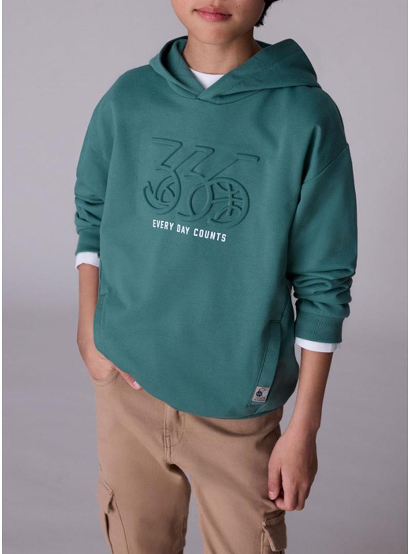 Moletom Mayoral. Cor verde. Com capuz. Manga longa. Bolsos laterais. Estampado em relevo no peito. Acabamentos canelados. Ombros caídos. Etiqueta costurada em um bolso.