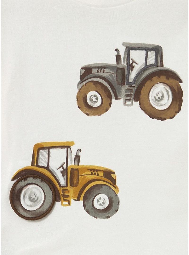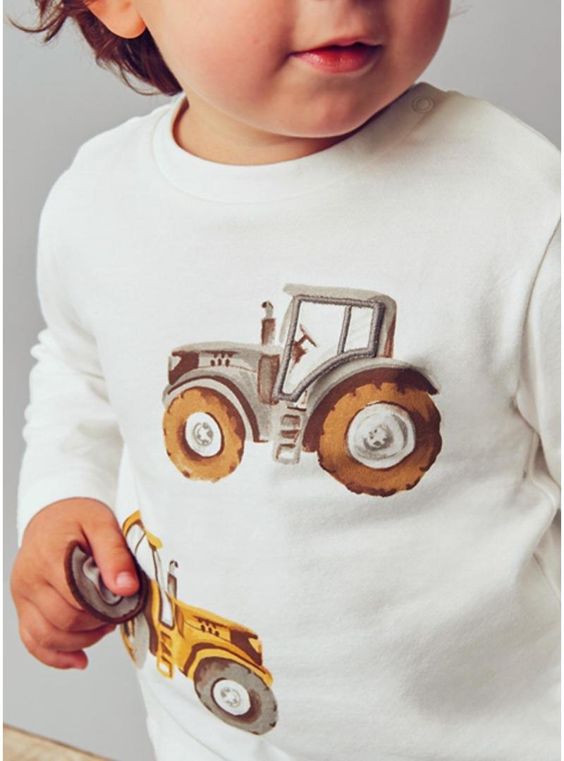 Camiseta Mayoral. manga comprida. Gola redonda. Botões de pressão no ombro. Estampado de tratores no peito.