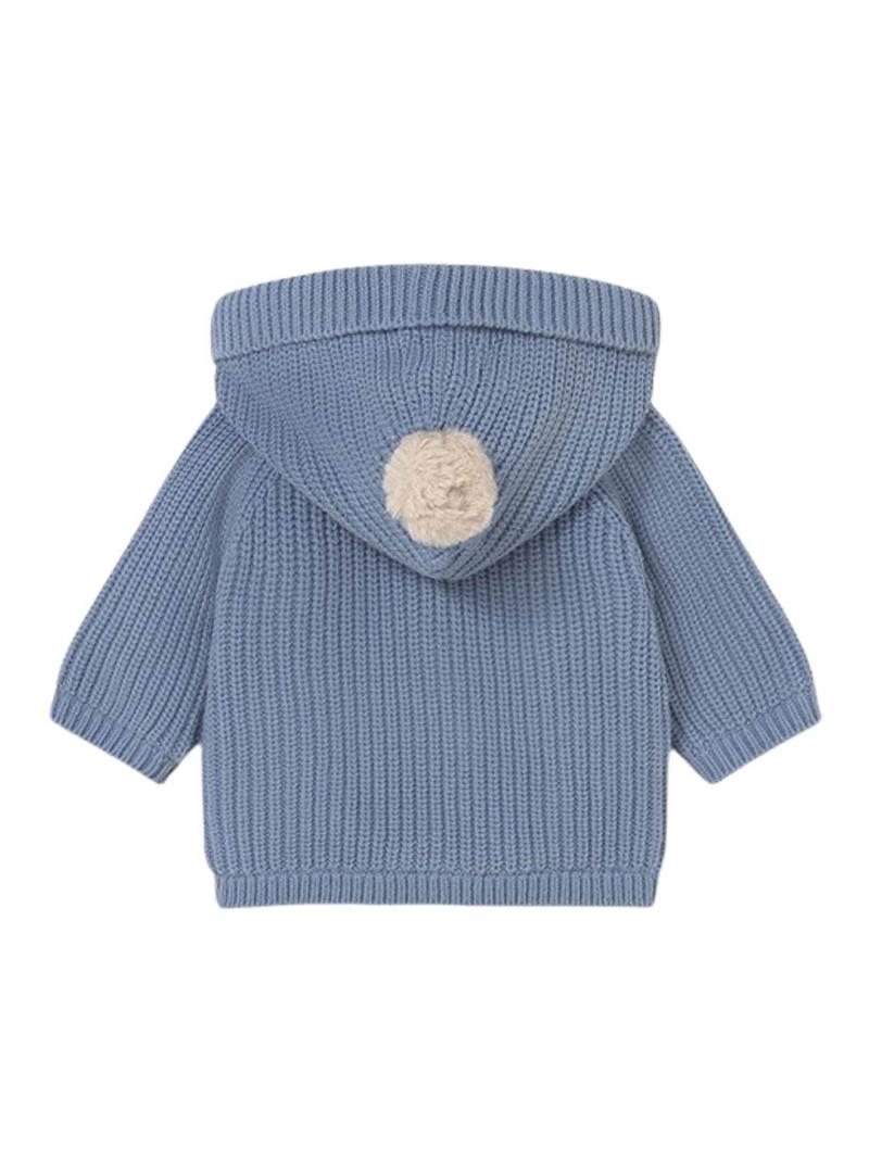 Jaqueta Mayoral. Cor azul. Manga comprida. Com capuz com pompom. Fecho com zíper frontal e alamares. Tecido de tricô com toque suave. Bolsos na parte da frente.