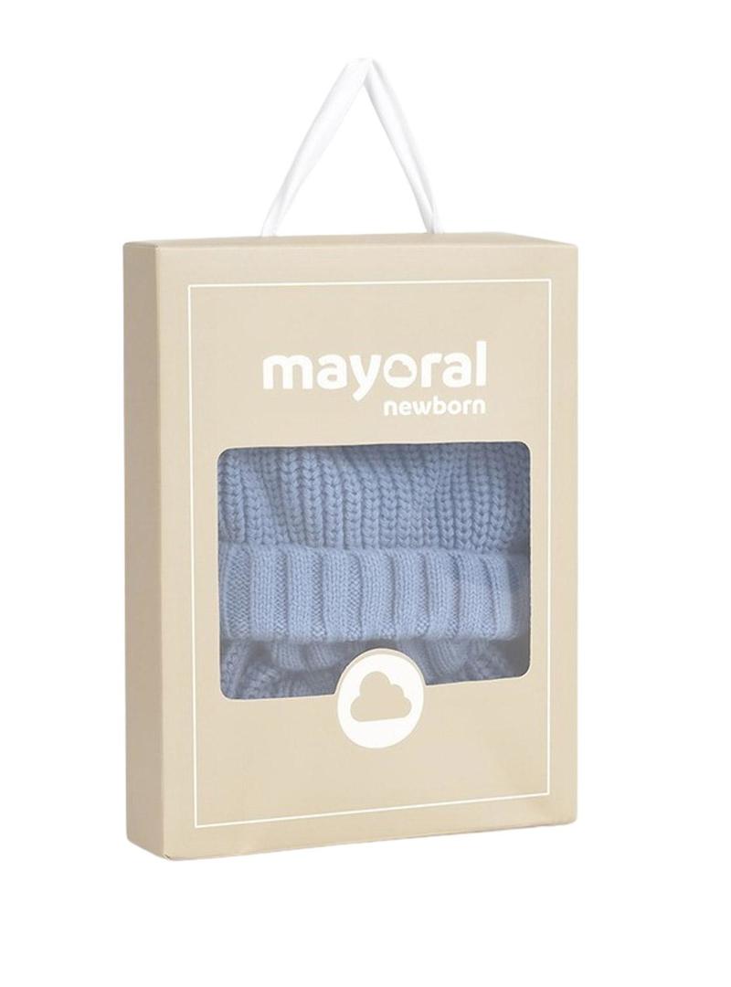 Conjunto de Mayoral. Para bebê. Touca e luvas. Cor azul. Malha de tricô macio. Touca com pom-pom.