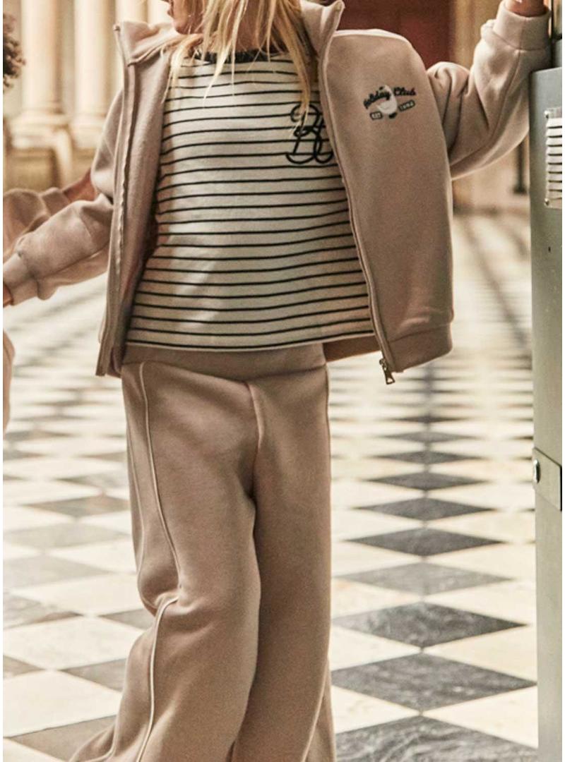 Conjunto de treino Mayoral. Cor bege. Duas peças. Moletom de manga comprida. Gola alta. Fechamento com zíper. Bolsos laterais. Faixas nas mangas. Bordado no peito. Calça larga. Cintura elástica. Faixas decorativas.