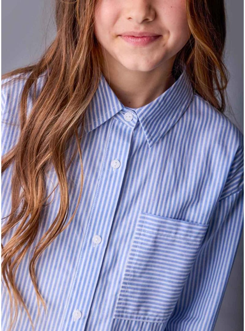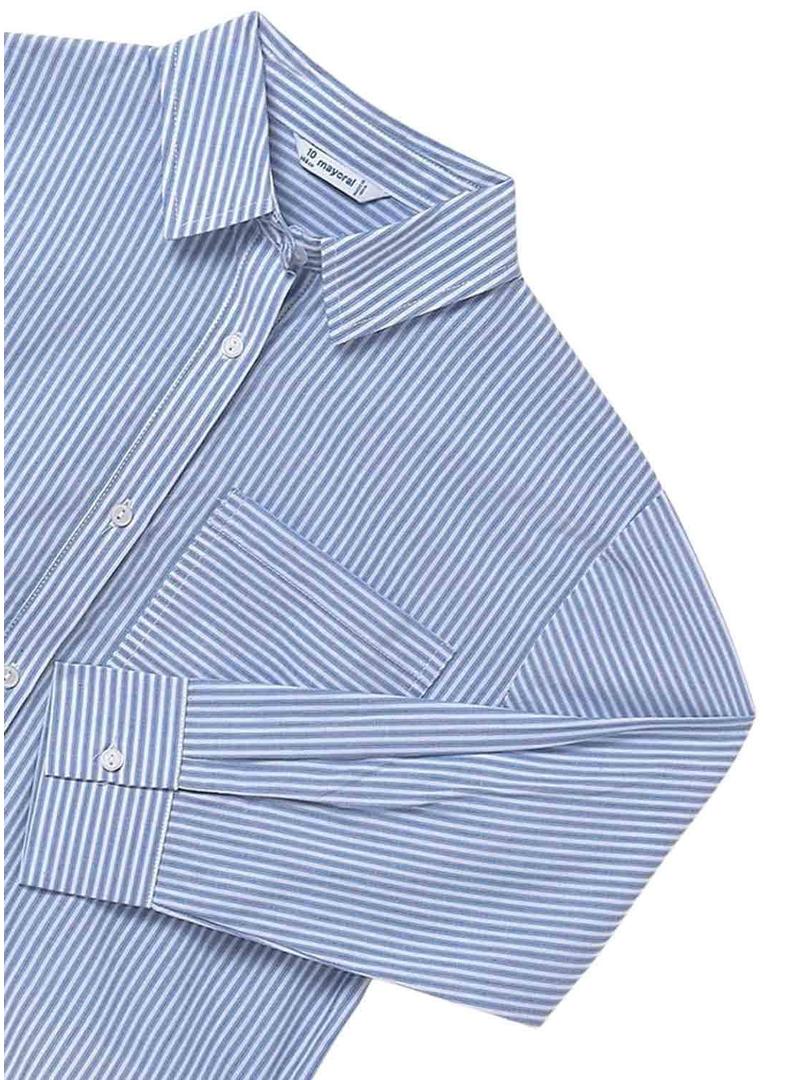 Camisa Mayoral. Manga comprida. Estampa de riscas. Bolso no peito. Cor azul. Baixo arredondado. Fecho com botões na parte da frente. Tecido de popelina.
