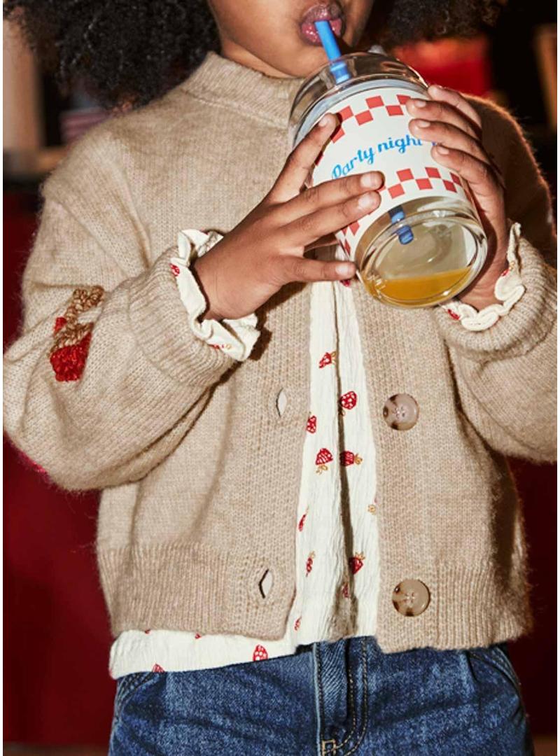 Jaqueta Mayoral. Cor bege. Manga comprida. Gola redonda. Fecho com botões na parte da frente. Tecido de malha suave. Bordados decorativos.