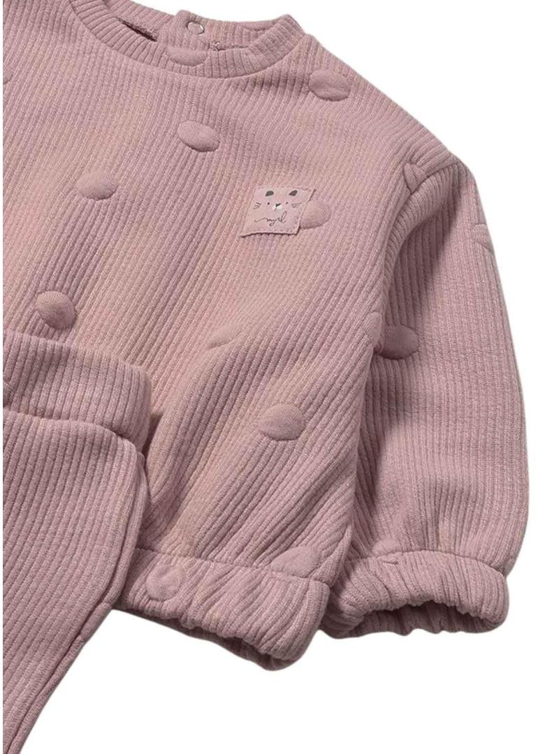 Conjunto Mayoral. Cor-de-rosa. Tecido acolchoado. Para menina. Moletom com gola redonda. Manga comprida. Botões na parte de trás do pescoço. Calça cor-de-rosa. Cintura elástica. Tecido acolchoado e quente. Barra elástica.