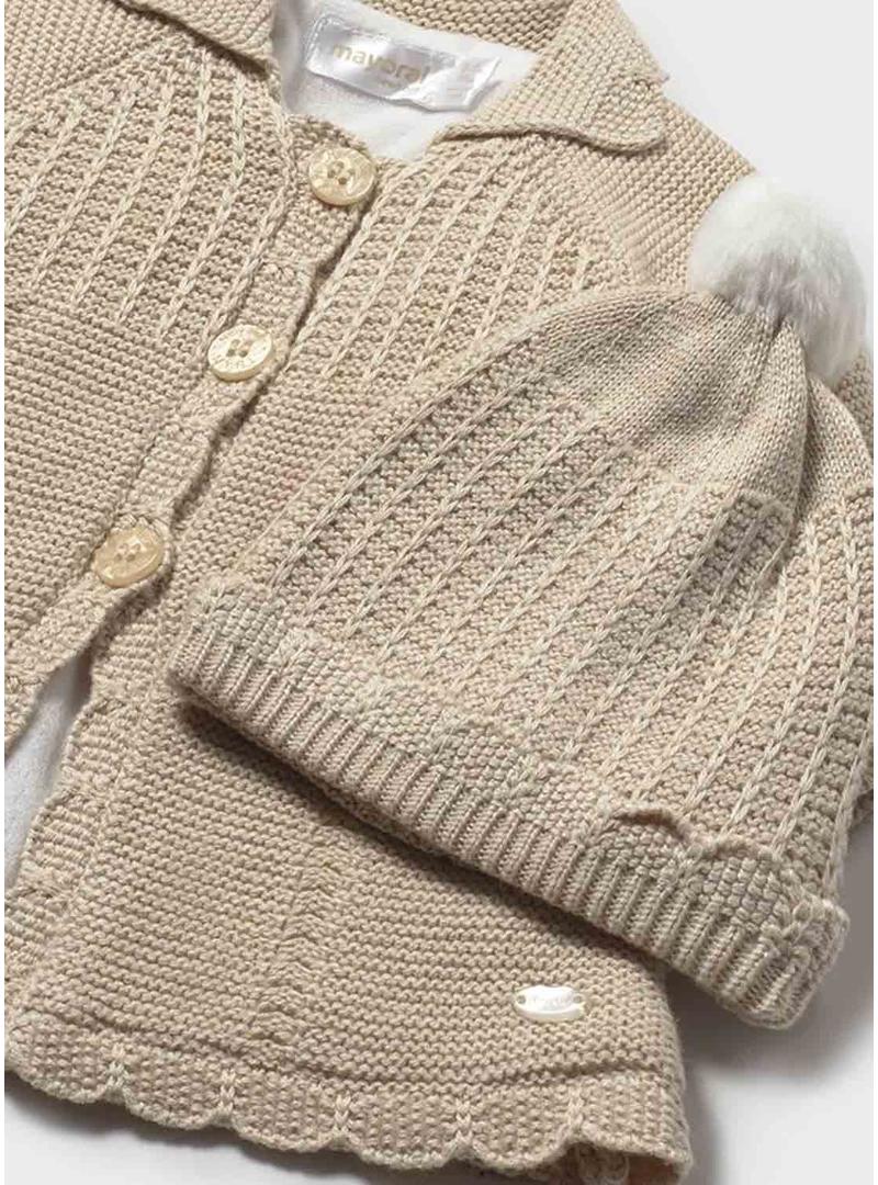 Casaco e gorro Mayoral tricotado em tom de tostado para bebê.