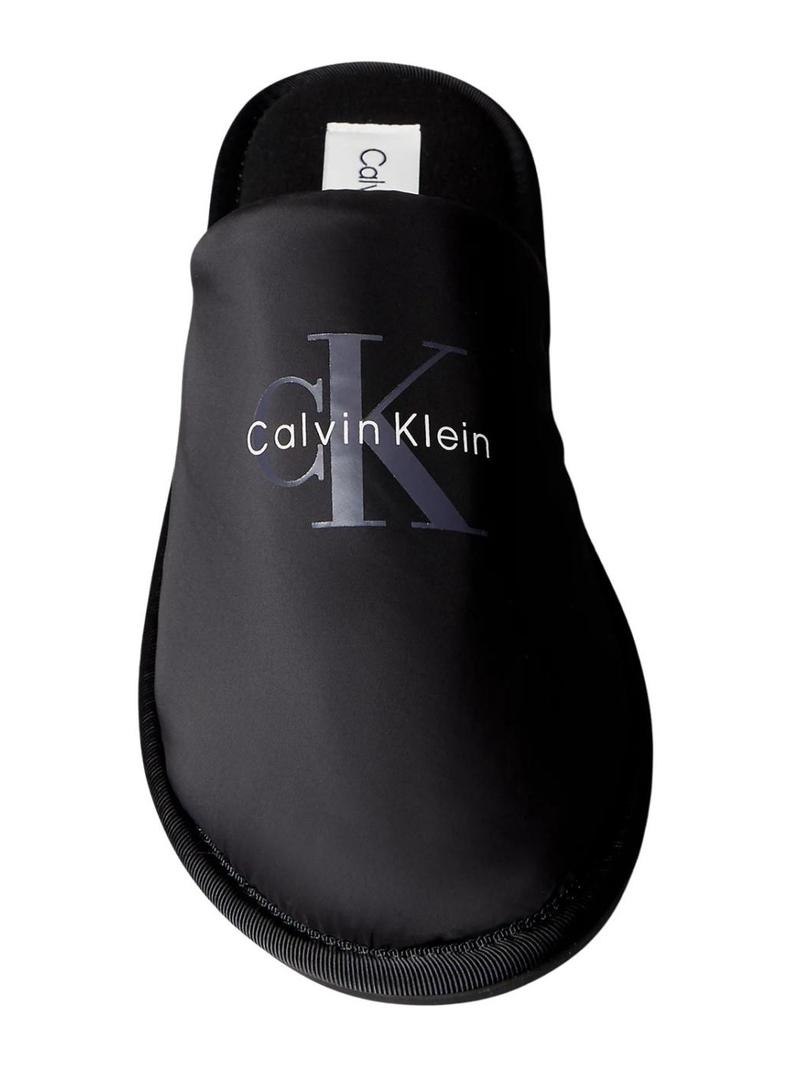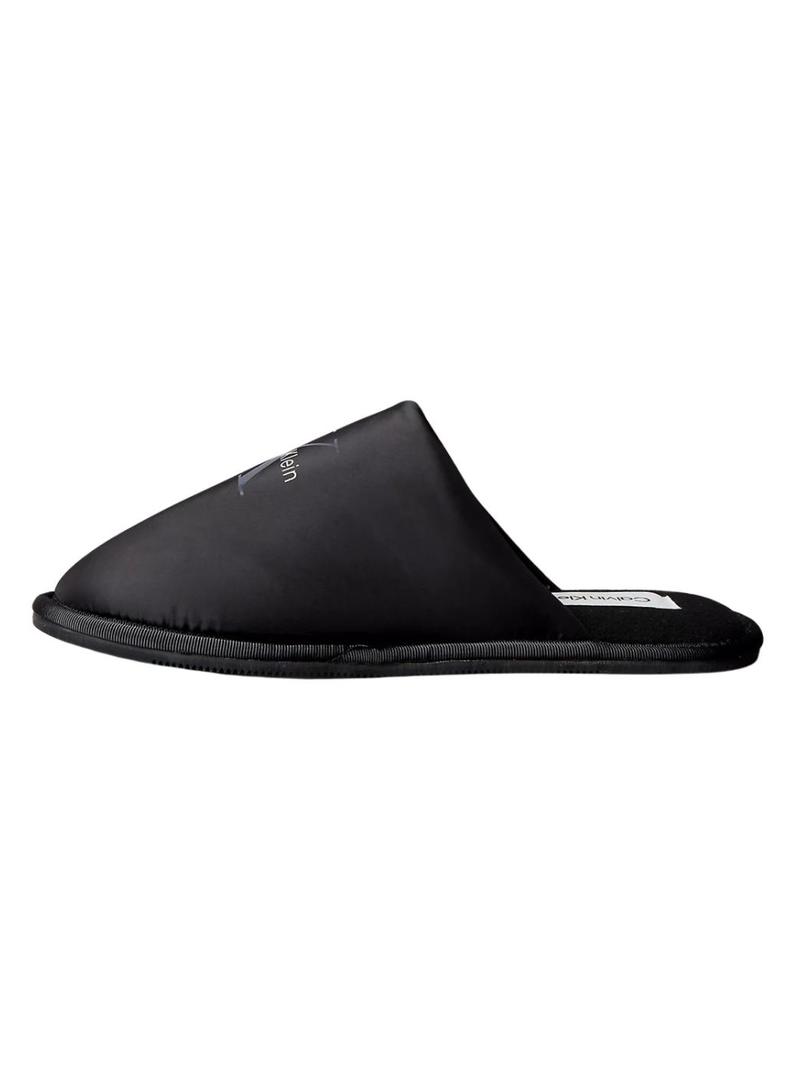 Sapatilhas de casa Calvin Klein. Cor preta. Parte superior acetinada. Palmilha acolchoada. Forro de poliéster aveludado. Sola de agarre de TPR. Logotipo distintivo da Calvin Klein no peito do pé.