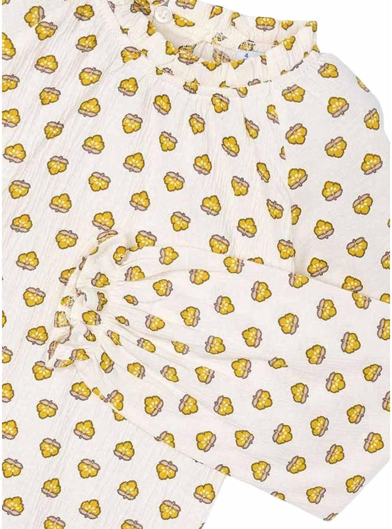Camiseta Mayoral. Manga comprida. Detalhe de babado na boca da manga. Abertura com botão no pescoço. Tecido de bambula.