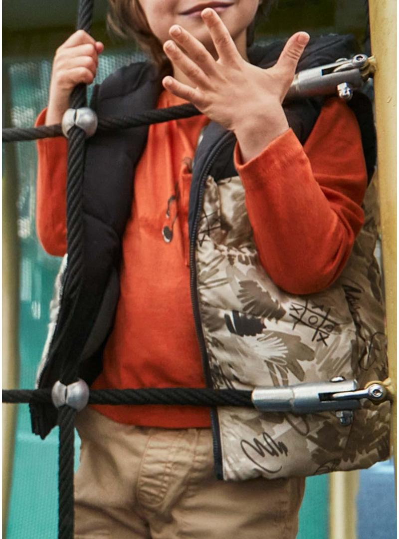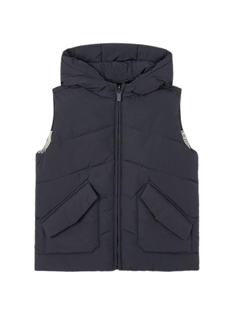 Colete Mayoral. Com capuz. Exterior com efeito acolchoado. Reversível. Fecho com zíper. Estampado. Interior cinza. Bolsos frontais.