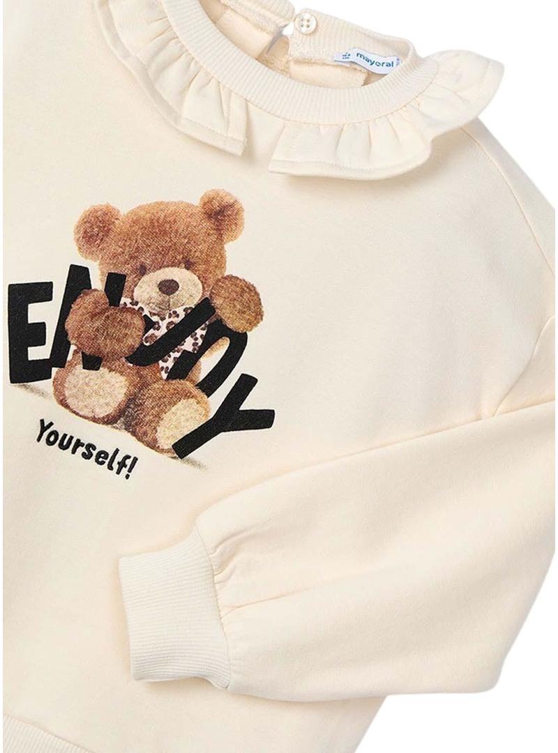 Moletom Mayoral. Manga comprida. Gola redonda com babado. Fechamento com botão no pescoço. Barra e punhos com ponto elástico. Estampa no peito. Detalhe de letras bordadas.