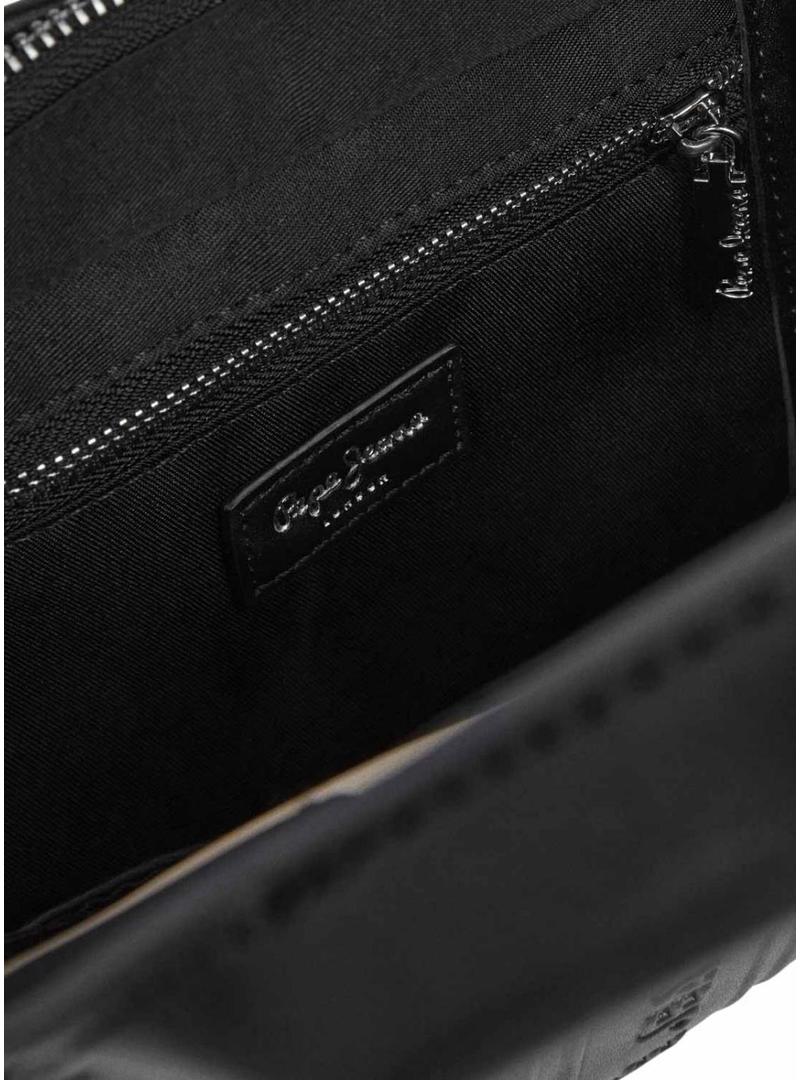 Bolsa Pepe Jeans. Formato retangular. Bicolor. Branco e preto, de pele sintética. Fecho de correr na parte superior. Alças curtas. Alça de ombro ajustável e removível. Logo em relevo na frente e atrás. Bolso na parte da frente. Bolso interior com fecho de correr. Medidas: 10,5 x 26 x 18 cm.