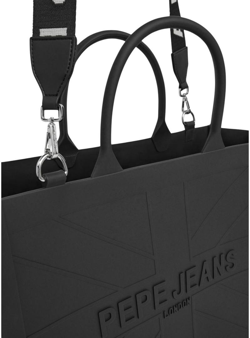 Bolsa Pepe Jeans. Tecido de borracha. Cor preta. Formato Tote. Alças curtas. Alça de ombro ajustável e removível em lona. Logotipo estampado na alça. Bolsa interior com cordão de fecho. Logotipo em relevo com bandeira Union Jack na parte frontal e traseira.