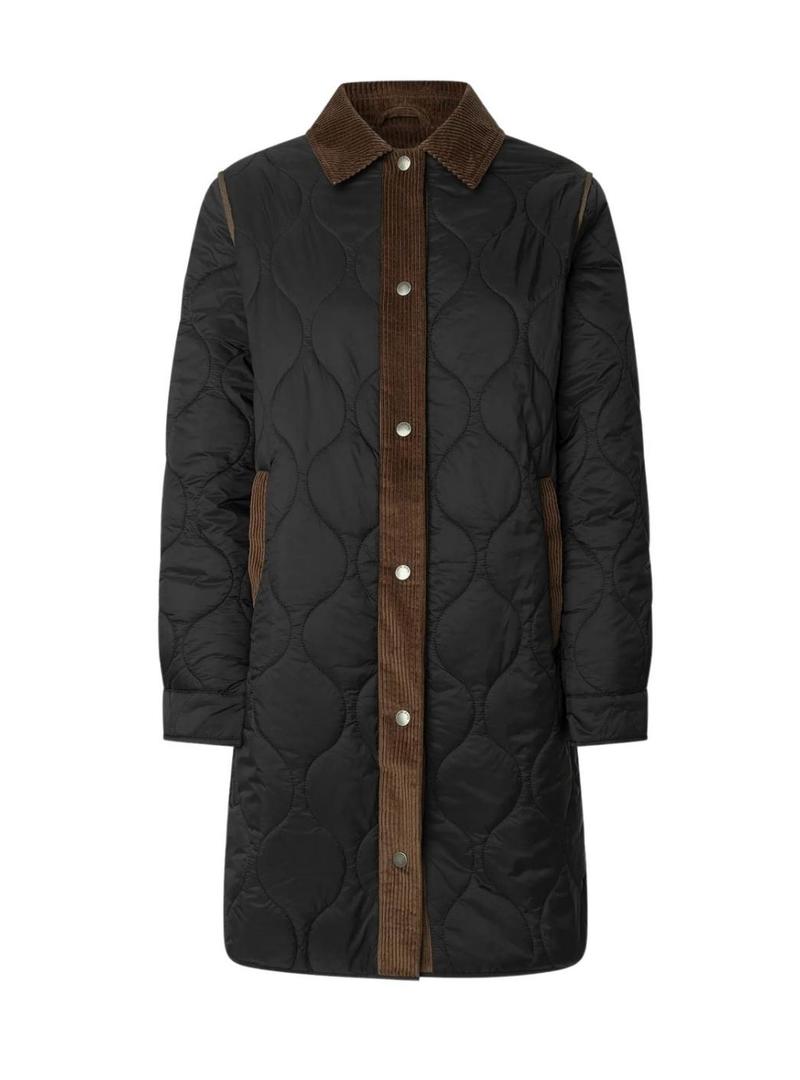 Casaco acolchoado Pepe Jeans. Cor preta. Tecido resistente. Gola camiseira. Carcela de veludo em contraste. Painéis acolchoados. Fecho frontal com botões de pressão. Patch de borracha com logo nas costas. Bolsos laterais. Logo estampado no interior.