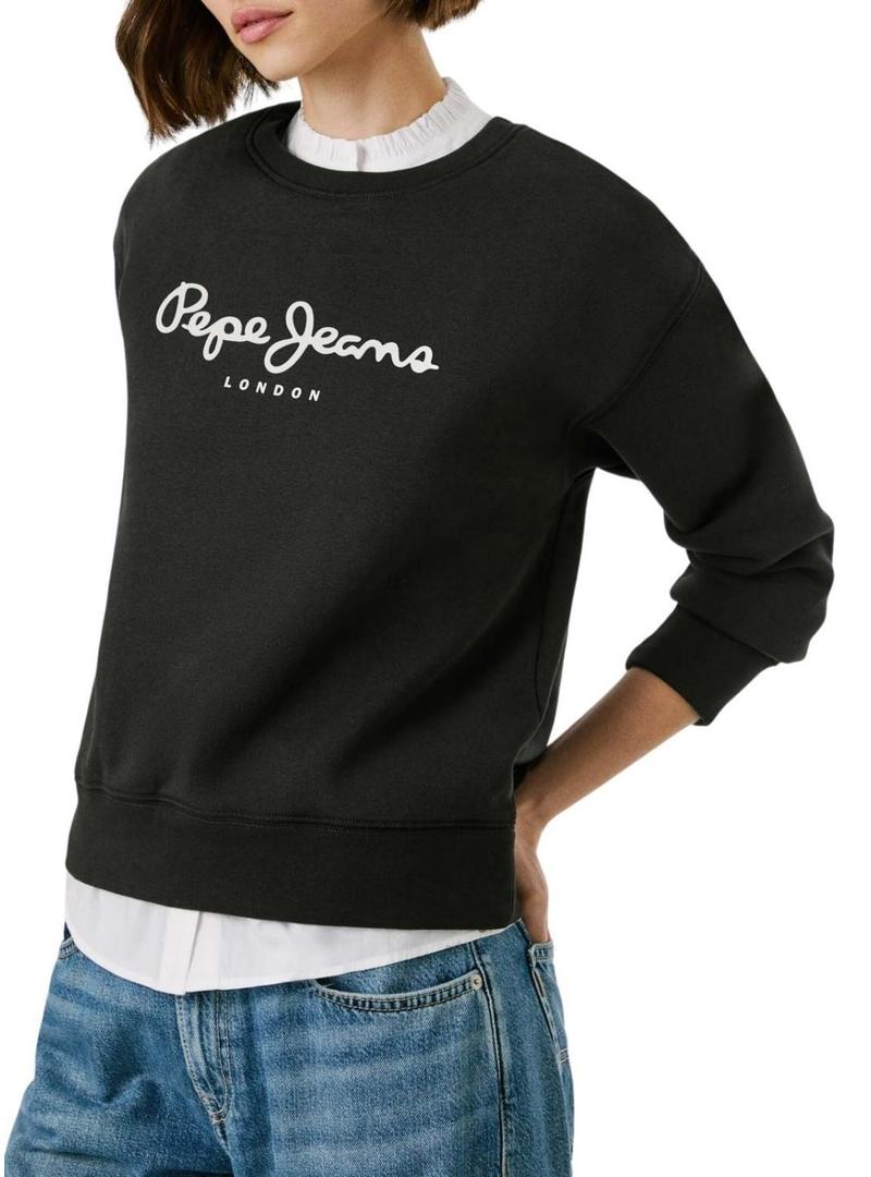 Moletom Pepe Jeans. Cor preta. Mangas compridas. Ombros caídos. Gola redonda canelada. Logo em contraste estampado no peito. Acabamentos canelados. A modelo veste o tamanho S.