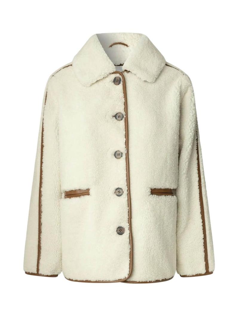 Casaco Pepe Jeans. Cor bege. De carneiro. Gola camisa removível. Frente com botões. Detalhes em efeito de pele. Bolsos laterais. Remendo de pele com logotipo nas costas. O modelo veste o tamanho S.