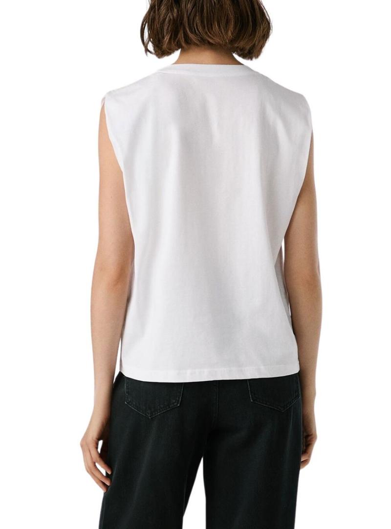 Camiseta Pepe Jeans. Tecido leve. Cor branca. Gola redonda canelada. Sem mangas. Logotipo com efeito desgastado estampado no peito. Tachinhas decorativas no estampado. A modelo veste o tamanho S.