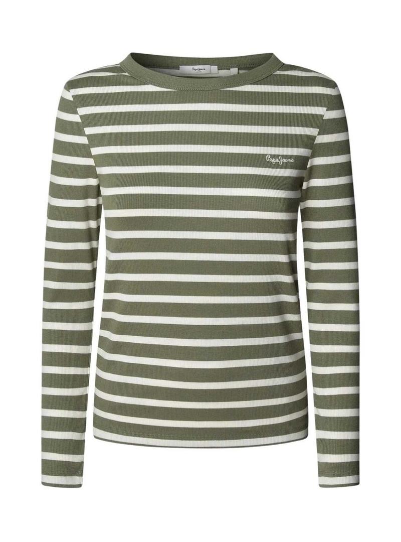 Camiseta Pepe Jeans. Tecido canelado. Cor verde. Manga comprida. Estampa de listras. Gola redonda. Logo bordado no peito. Acabamento com costura dupla nas mangas e na barra. A modelo veste o tamanho S.