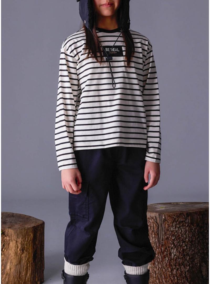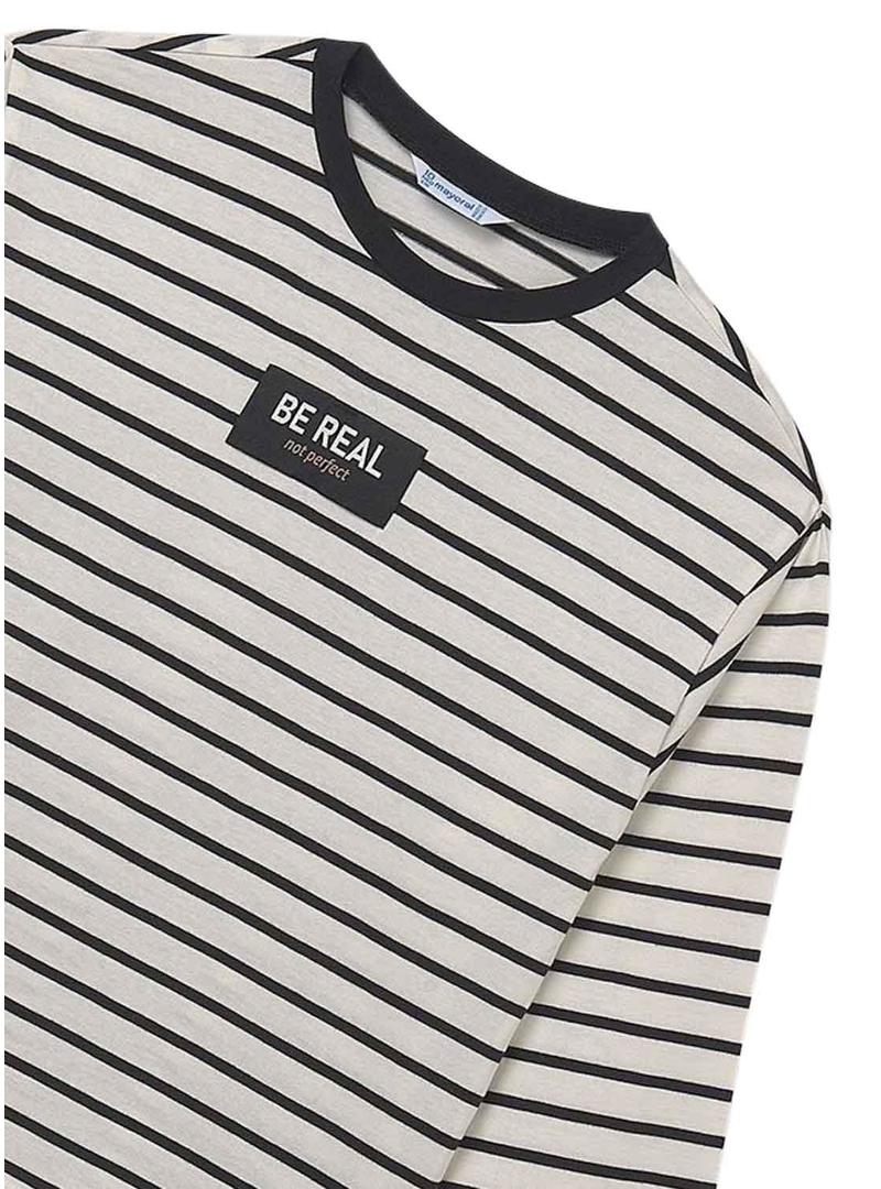 Camiseta Mayoral. Listrada. Gola redonda. Manga comprida. Detalhe de remendo no peito. Corte oversize.