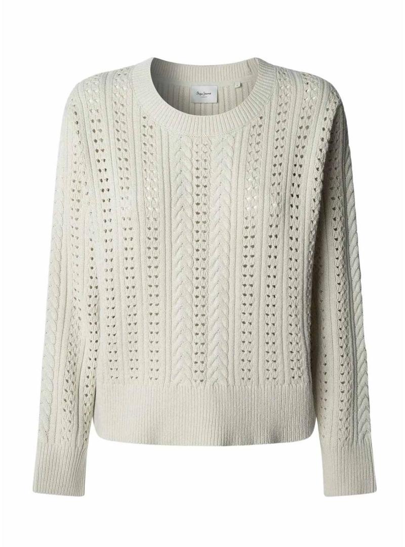 Camisola Pepe Jeans. Cor bege. Gola redonda. Manga comprida. Ombros caídos. Detalhes em ponto trançado. Acabamentos canelados. O modelo veste o tamanho S.