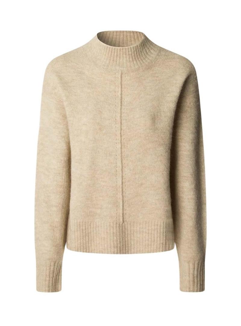 Camisola Pepe Jeans. Cor bege. Gola perkins. Manga comprida. Ombros caídos. Feito com mistura de lã. Costura decorativa na frente. Acabamentos canelados. A modelo está usando o tamanho S.