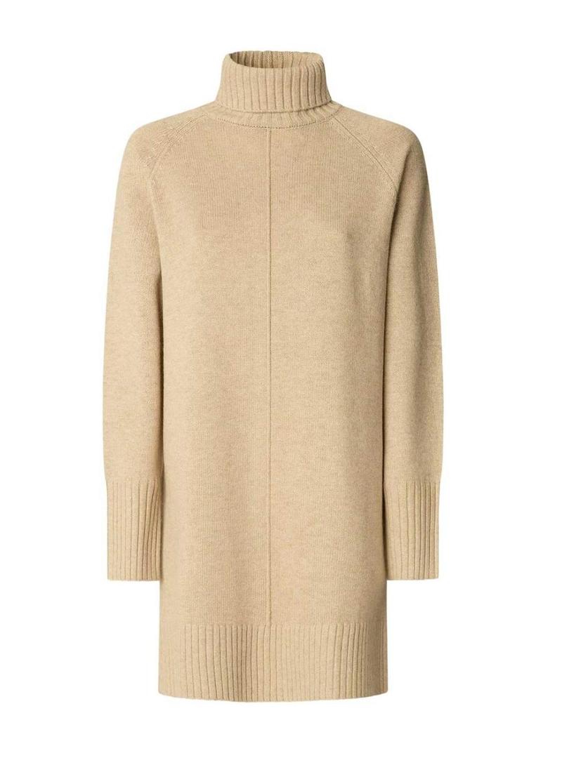 Vestido Pepe Jeans. Cor tostado. Formato curto. Tecido de malha com lã. Gola alta com dobra. Manga comprida. Costura central decorativa na parte da frente. Acabamentos canelados. Placa circular com logotipo na parte de trás. O modelo está usando o tamanho S.