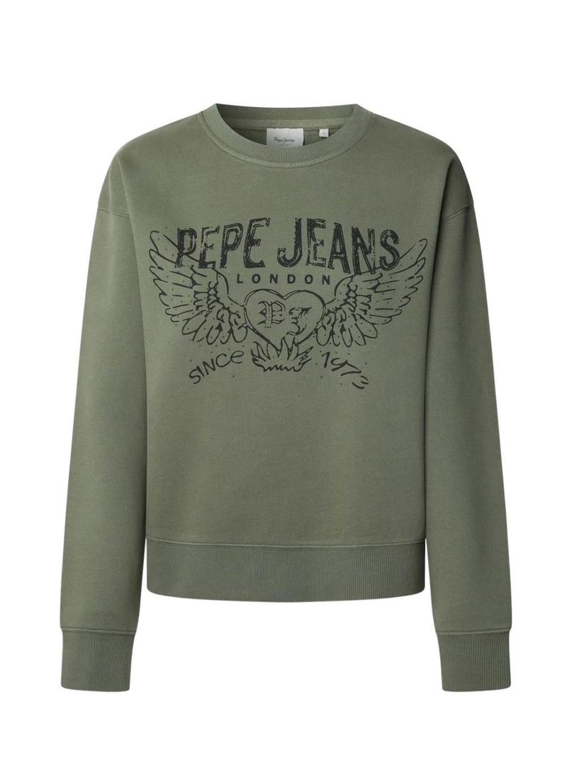 Moletom Pepe Jeans. Cor verde. Gola redonda canelada. Acabamentos canelados. Logotipo na frente com estampa de coração com asas.