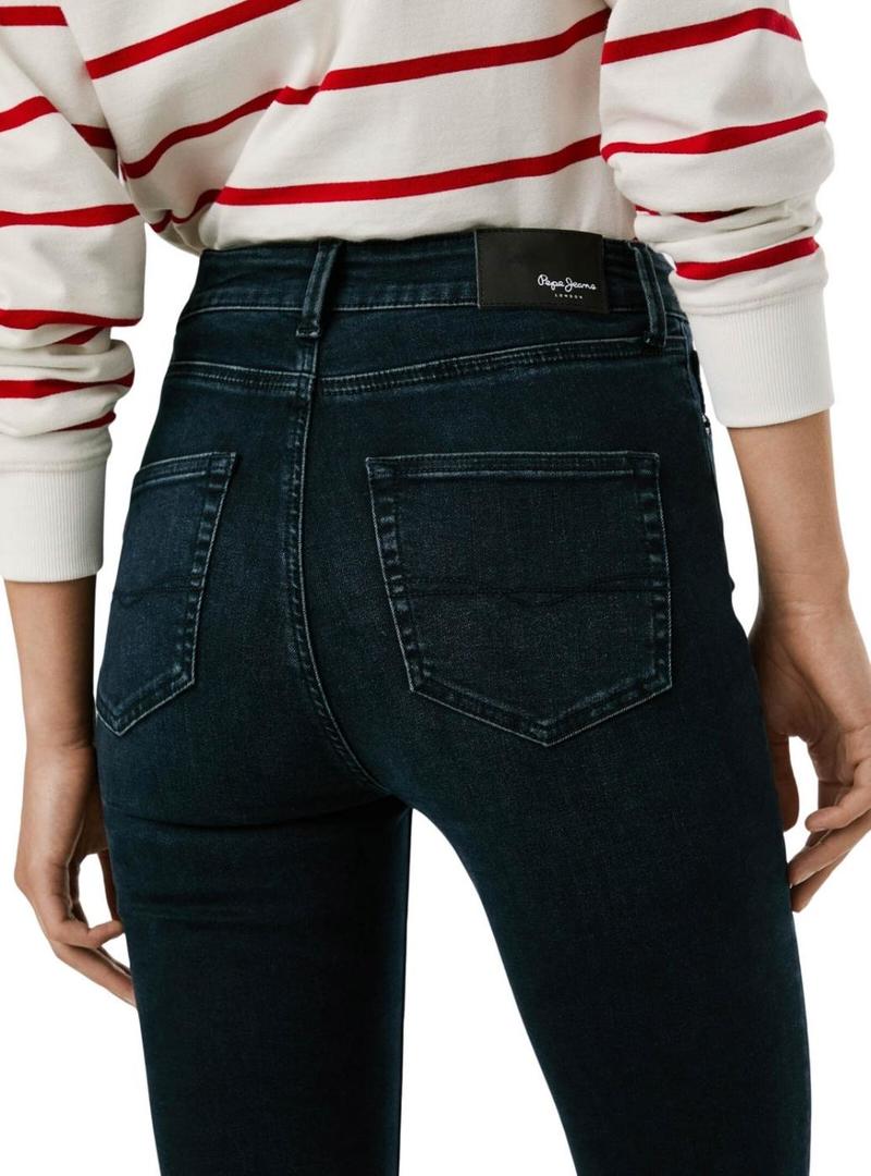 Calça de ganga Pepe Jeans. Modelo Dion. Corte boca de sino. Cintura alta. Perna boca de sino. 5 bolsos. Fechamento com zíper. Detalhe de costura nos bolsos traseiros. Tecido denim elástico flexível. Lavagem azul intenso. Rebites com logotipo gravado.