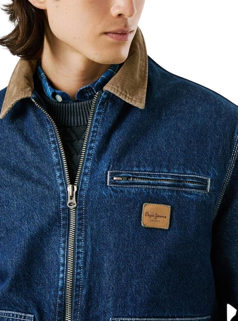 Jaqueta Pepe Jeans. Tecido denim rígido. Gola de veludo em contraste. Dois bolsos de remendo. Um bolso no peito com zíper. Um bolso interno. Fechamento com zíper. Barra ajustável com botões. Remendo de couro com logo no peito.