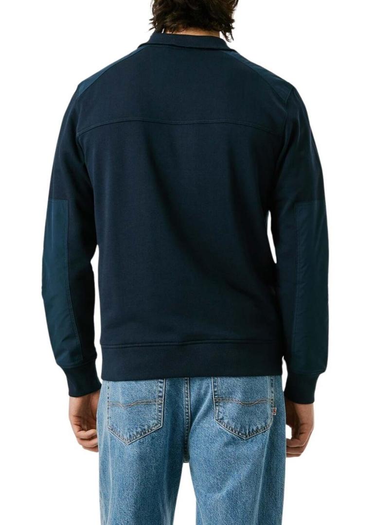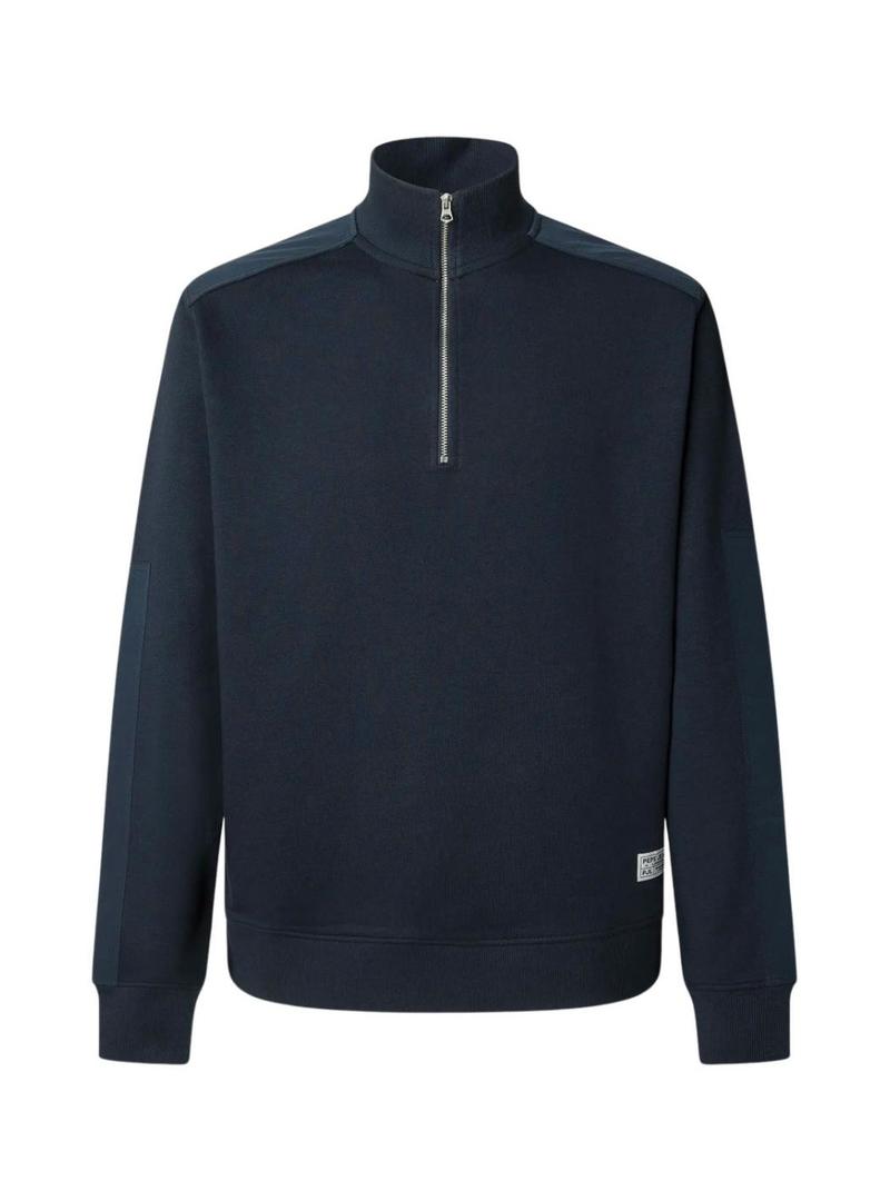 Moletom Pepe Jeans. Tecido de pelúcia. Cor marinho. Manga comprida. Gola alta com meio zíper. Etiqueta com logo costurada na parte inferior. Acabamentos canelados. Detalhes de remendos em contraste. O modelo veste o tamanho M.