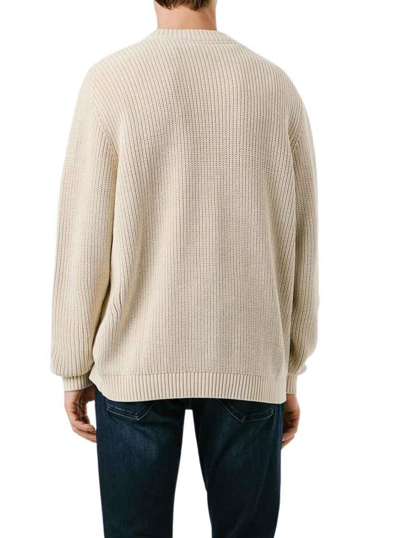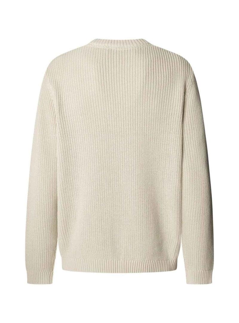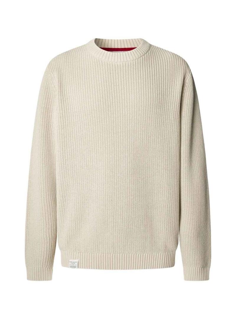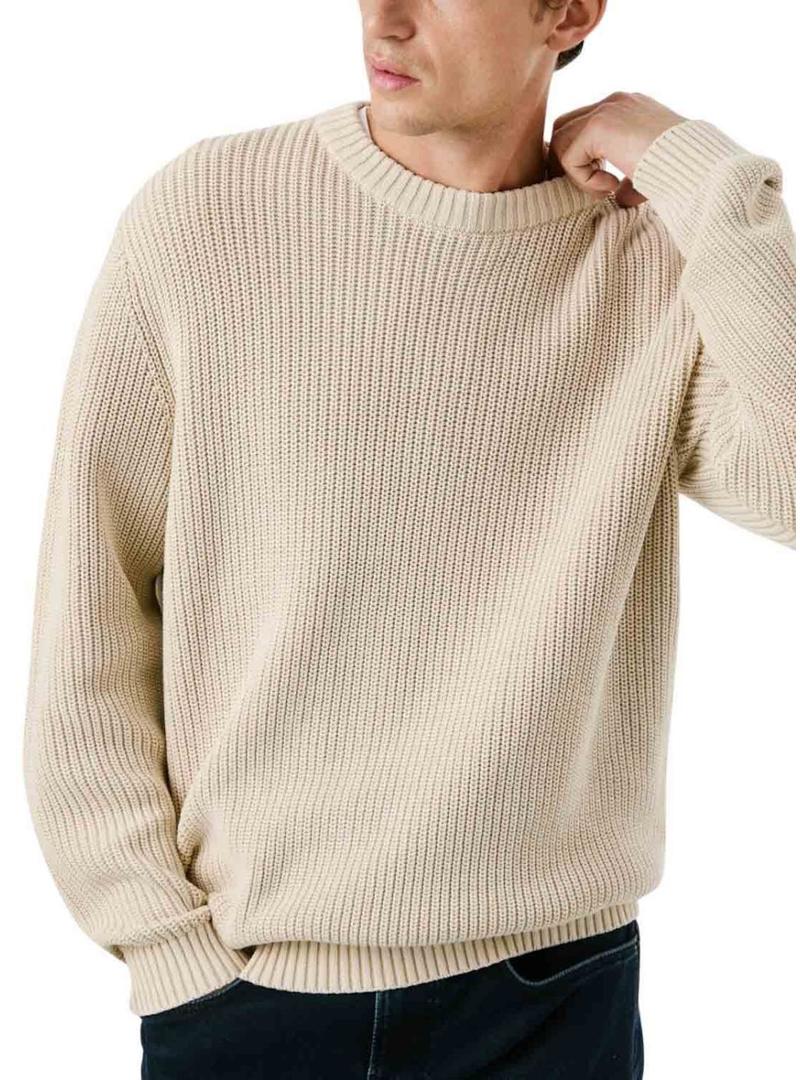 Camisola Pepe Jeans. Cor bege. Manga comprida. Gola redonda. Formato regular. Tecido de malha canelada. Etiqueta da marca na bainha. O modelo veste o tamanho M.