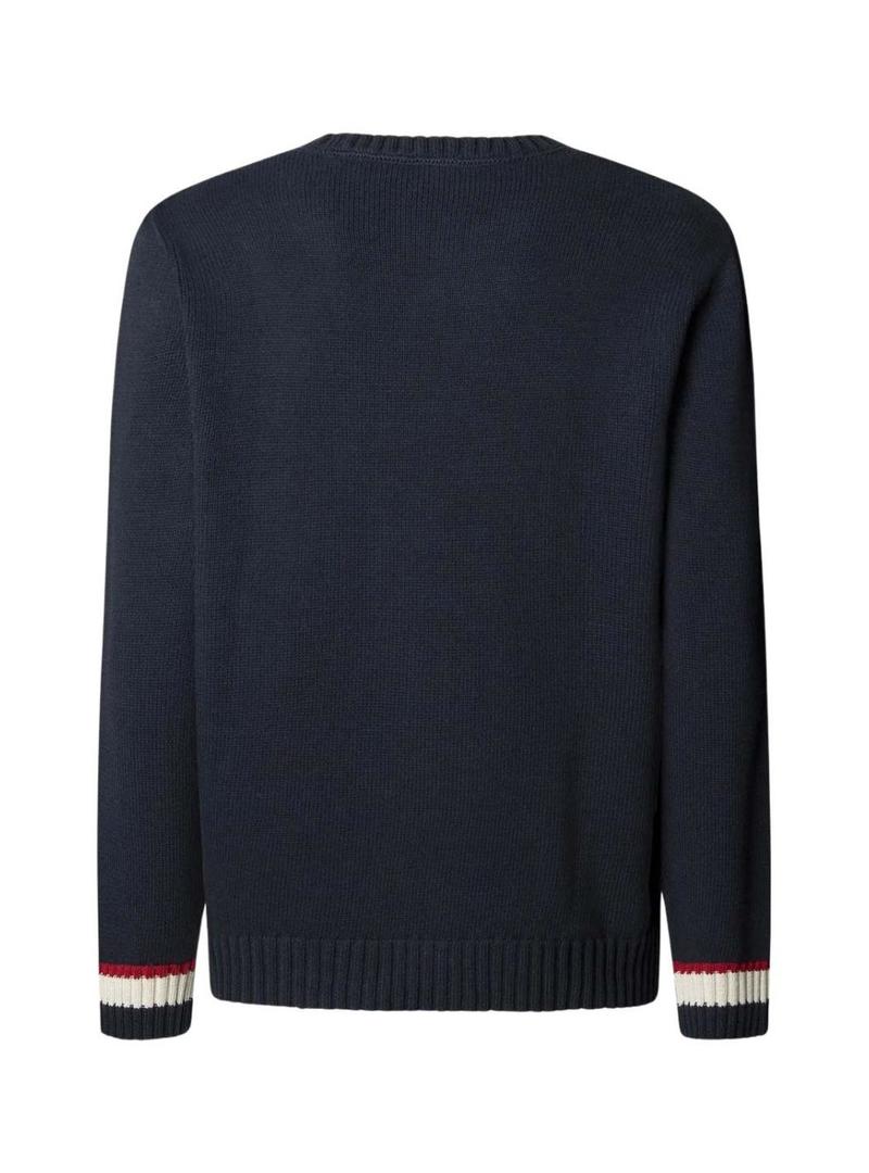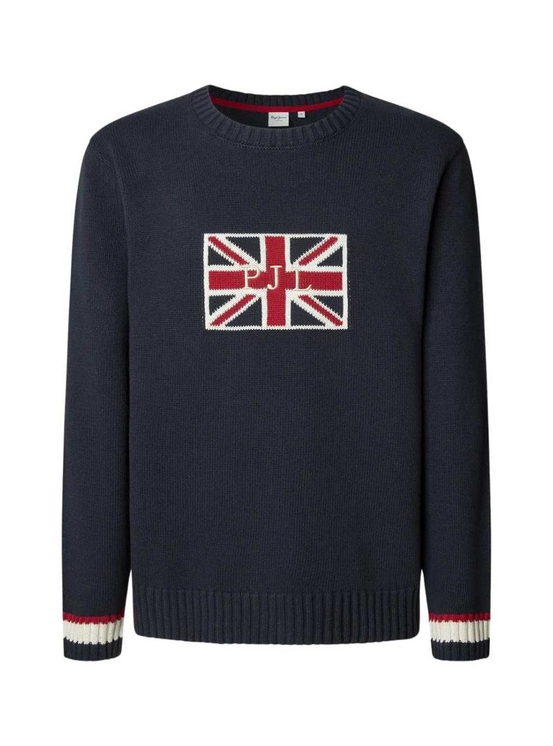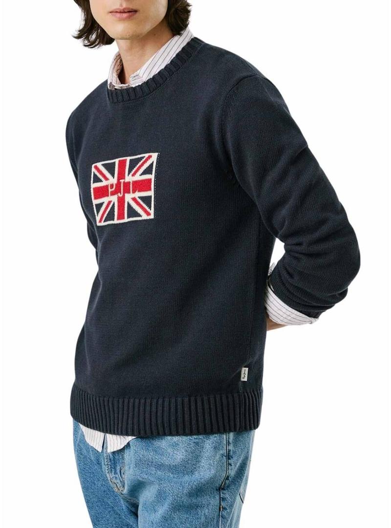 Camisola Pepe Jeans. Cor marinho. Manga comprida. Gola redonda. Formato regular. Logo PJL com a bandeira Union Jack bordada no peito. Acabamentos canelados. Etiqueta da marca costurada na lateral. O modelo veste tamanho M.