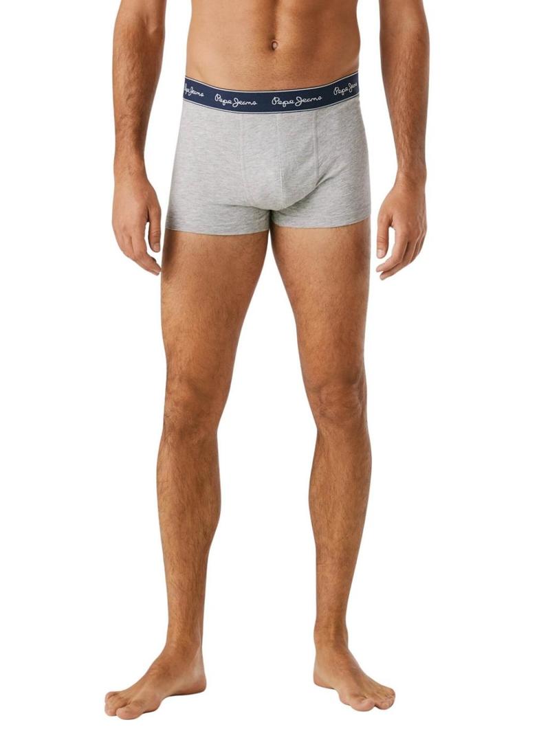 Pacote de 3 cuecas Pepe Jeans. Boxers em tecido de algodão elástico. Cintura regular. Um com estampa com logotipos da marca. Dois lisos em cor marinho e cinza. Cintura com o logo da marca. Perna curta.