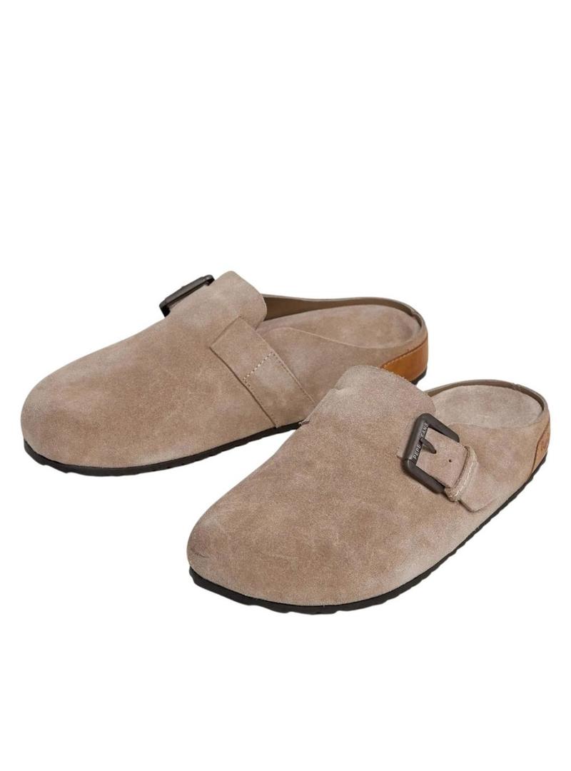 Tamancos Pepe Jeans. Cor bege. Parte superior em camurça. Tira com fivela metálica. Palmilha anatômica. Logotipo clássico na palmilha. Sola dentada de TR.
