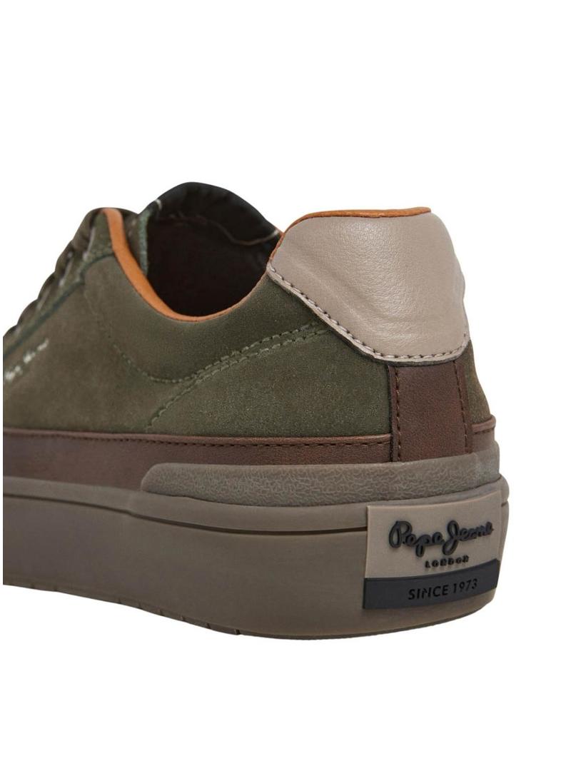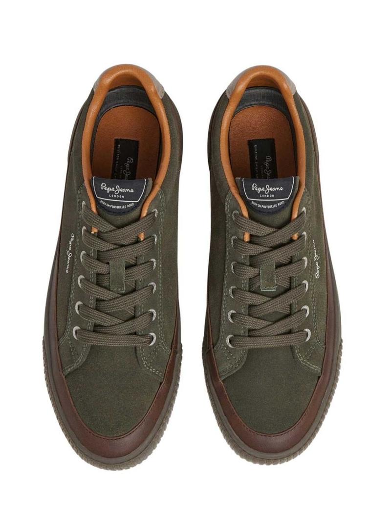Sapatilhas Pepe Jeans. Cor verde. Perfil baixo. Tecido de camurça. Fecho com cordões. Logotipo lateral. Palmilha de espuma termoformada e removível. Parche de borracha com logotipo em relevo no calcanhar. Sola de borracha reforçada. Acabamento marrom em contraste.
