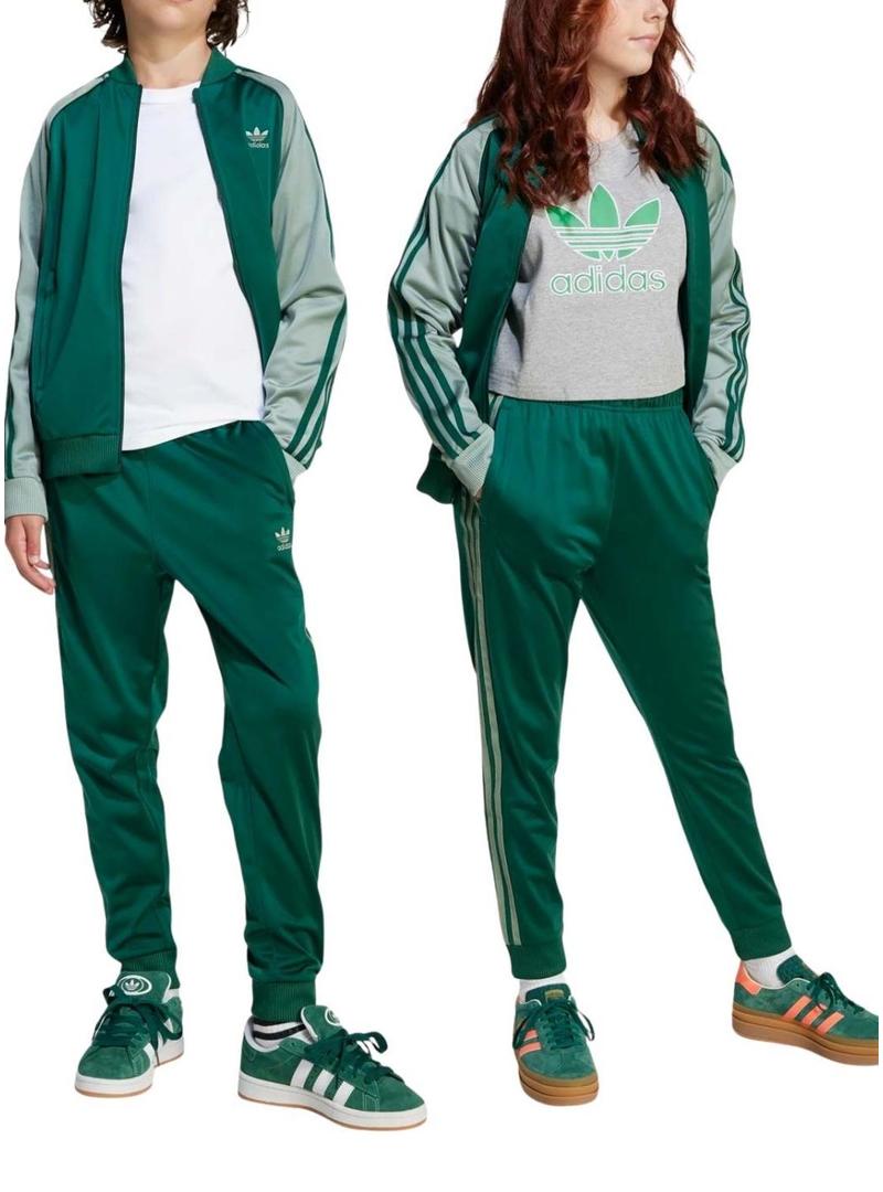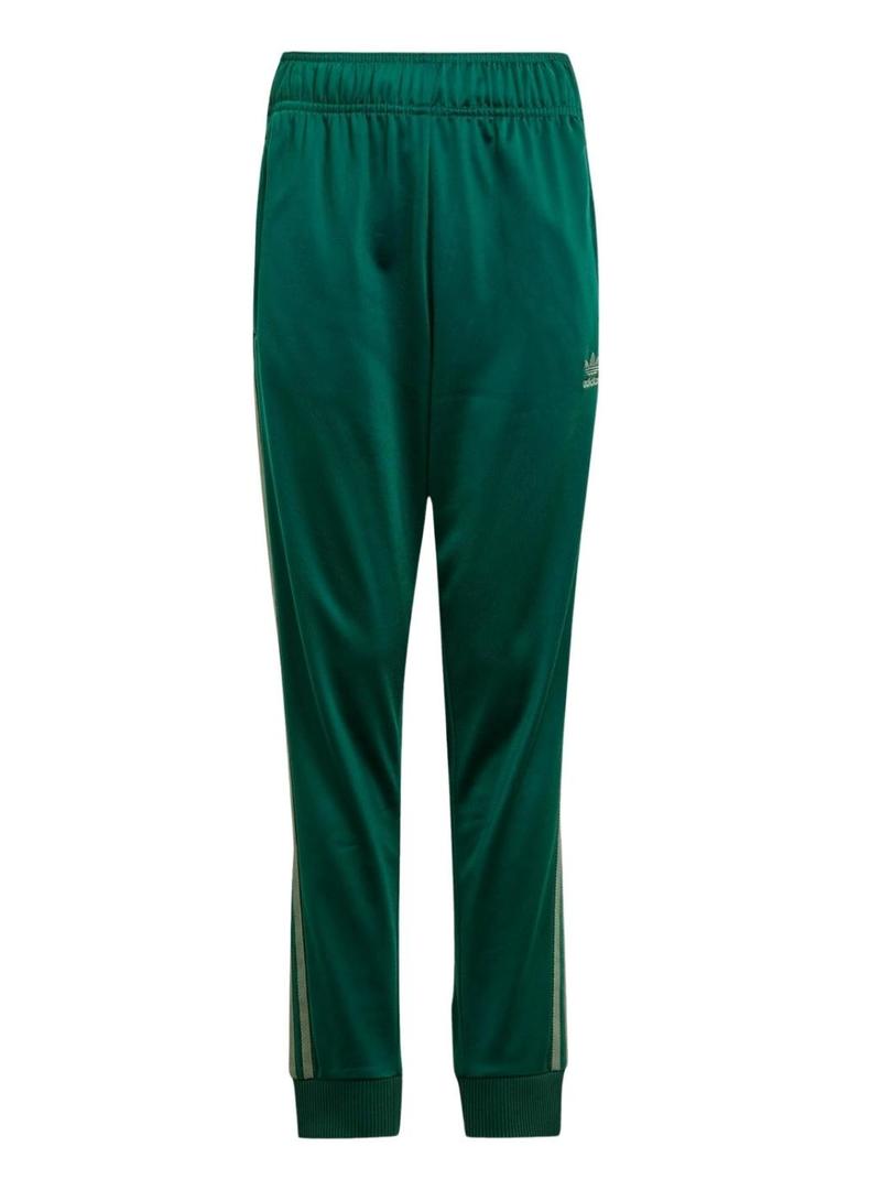 Calças Adidas. Modelo Adicolor SST. Cor verde. Cintura elástica com cordão ajustável. Listras características da marca nas laterais. Corte clássico.