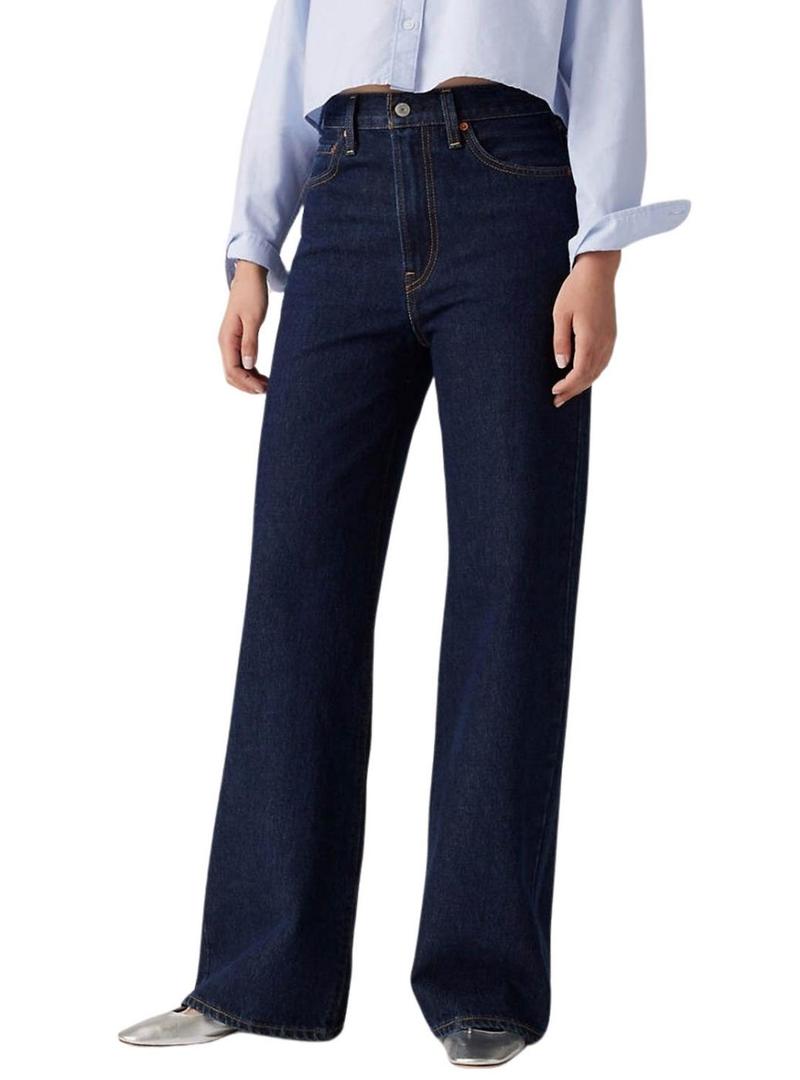 Calça jeans Levis. Modelo Ribcage. Ajustado nos quadris e coxas. Cintura alta. Perna larga. Tecido denim não elástico. Fecho com zíper. 5 bolsos. Fabricado com algodão reciclado.