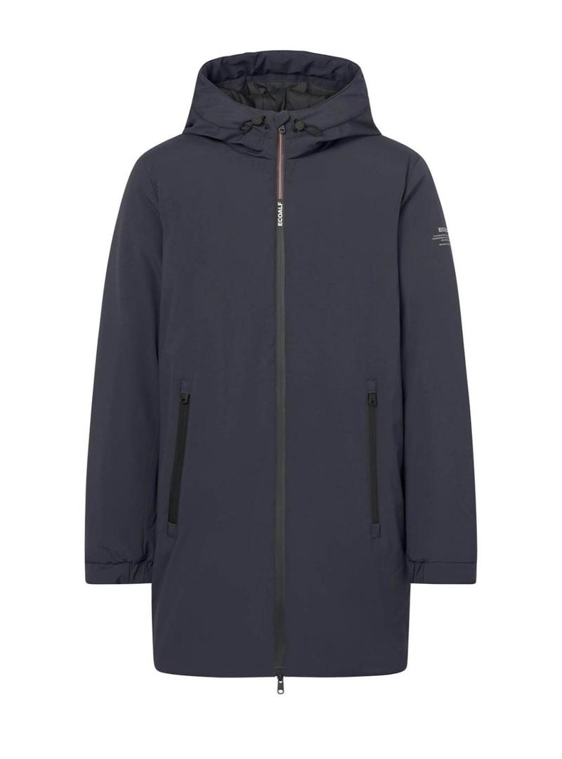 Casaco Ecoalf. Modelo Pau. Cor marinho. Ajuste regular. Comprimento acima do joelho. Fecho frontal com zíper. Bolsos frontais com zíper. Capuz ajustável com cordões. Bolso interno com zíper. Estampa da marca em uma manga. Repelente à água. Tecido impermeável e respirável. Livre de Pfc.