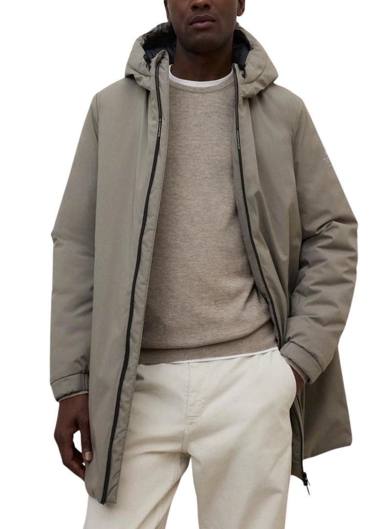 Casaco Ecoalf. Modelo Pau. Cor bege. Corte regular. Fecho frontal com zíper. Bolsos frontais com zíper. Capuz ajustável com cordões. Bolso interior com zíper. Estampa da marca em uma manga. Repelente à água. Tecido impermeável e respirável. Livre de Pfc. Marcação interior. O modelo mede 187 cm e veste tamanho M.