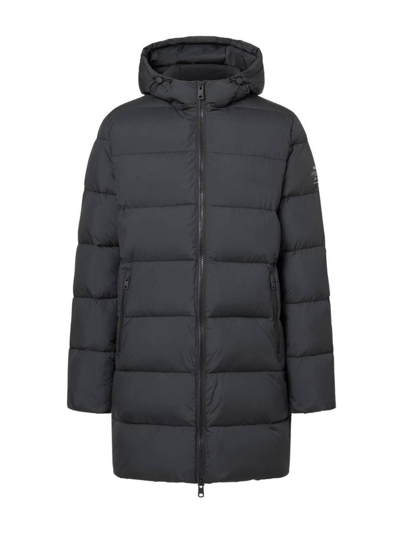 Casaco Ecoalf. Modelo Vintage. Cor cinza escuro. Tecido acolchoado. Comprimento 3/4. Fecho com zíper bidirecional personalizado. Gola alta. Capuz ajustável com cordões. Bolsos frontais com zíper. Estampa da marca na manga. Vegano. Livre de PFC. Repelente à água. O modelo veste o tamanho M.