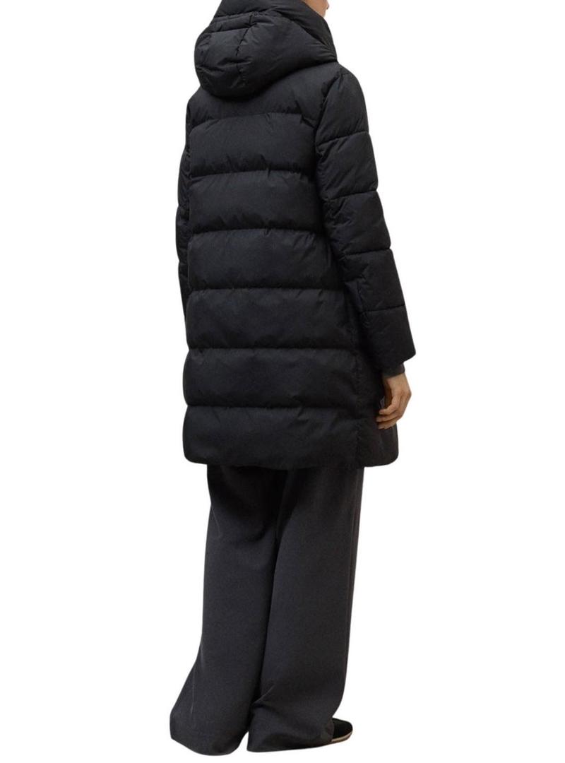 Casaco acolchoado Ecoalf. Modelo Manlie. Cor preta. Tecido repelente à água. Corte relaxado. Comprimento acima do joelho. Fecho com zíper bidirecional. Bolsos frontais com zíper. Capuz ajustável com cordões. Etiqueta da marca na manga. Livre de Pfc. Vegano. Enchimento PrimaLoft. O modelo veste o tamanho S.