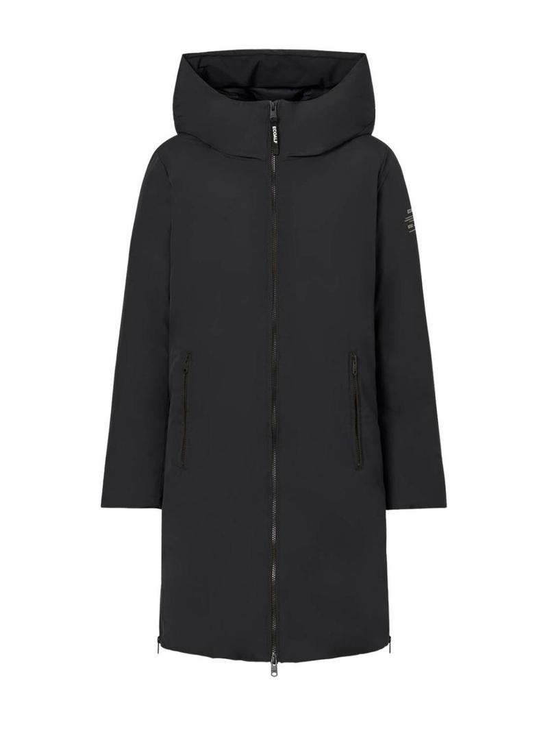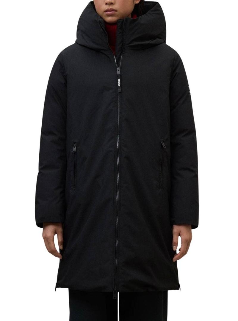 Casaco Ecoalf. Modelo Mati. Cor preta. Tecido impermeável e respirável. Interior acolchoado. Corte relaxado. Comprimento acima do joelho. Fecho frontal com zíper bidirecional. Manga longa. Bolsos com zíper. Aberturas laterais com zíper. Gola alta com capuz. Marca impressa na parte interna traseira. Estampa da marca em uma manga. Alças internas para os ombros. A modelo veste o tamanho S.