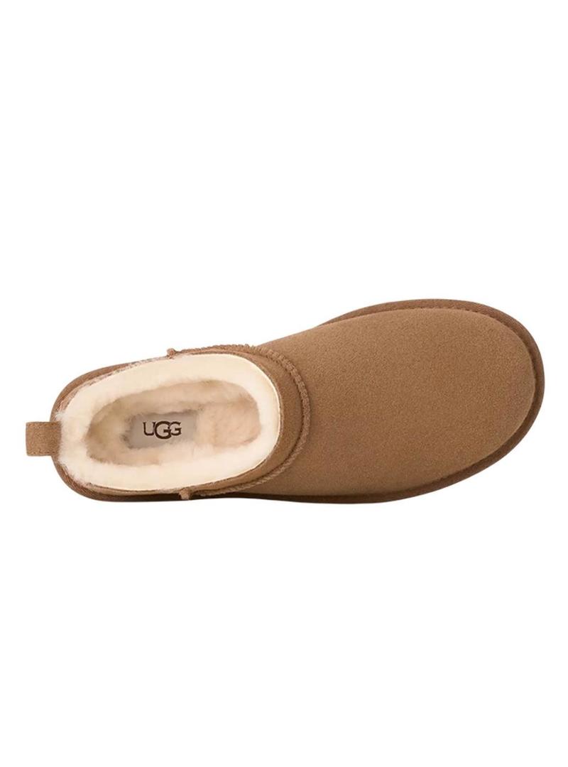 Botas UGG. Modelo Classic Micro. Cor bege. Perfil baixo. Parte superior em camurça genuína tratada hidrofugamente ou resistente à água. Forro de pele de ovelha de 10 mm no cano e 17 mm na parte superior e palmilha para maior conforto e regulação natural da temperatura. Sola leve de EVA SugarSole de cana-de-açúcar. Acabamento em tecido de poliéster reciclado. Logotipo UGG na etiqueta tecida na palmilha e na etiqueta de pele gravada no calcanhar.