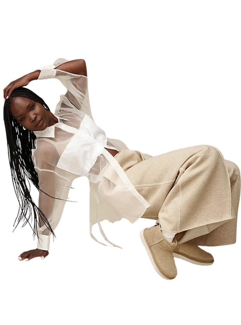 Botas UGG. Modelo Classic Ultra Mini Biarritz. Cor bege. Cano baixo. Parte superior de camurça felpuda texturizada. Costuras decorativas e detalhe traseiro com borla e aba de couro. Barra de camurça. Forro interior de pele de ovelha genuína para uma sensação suave e quente. Sola leve de EVA SugarSole feita com cana-de-açúcar sustentável. Acabamento têxtil feito com fibras de poliéster 100% recicladas. Logotipo UGG termo gravado no calcanhar. Sistema de tamanhos europeu.